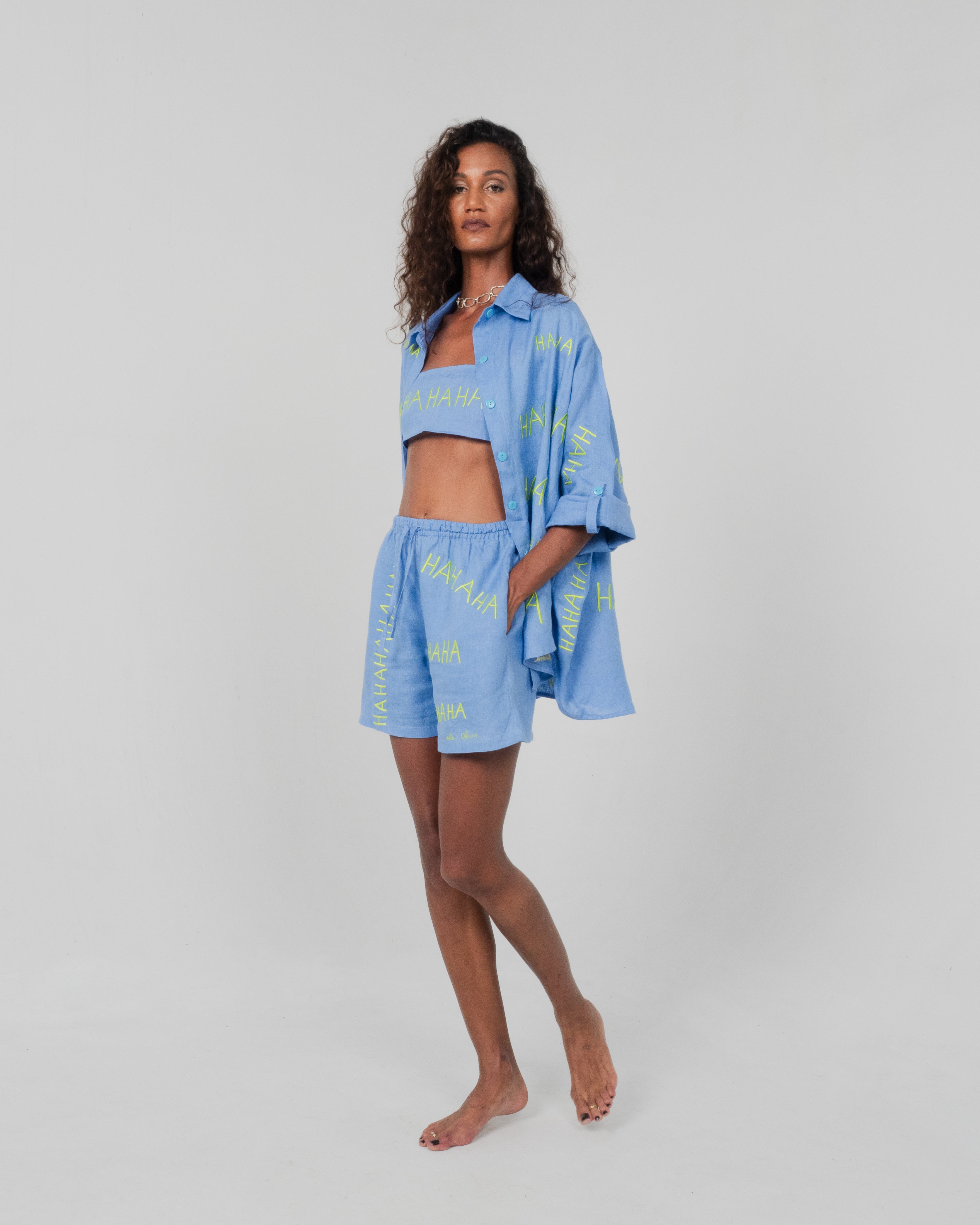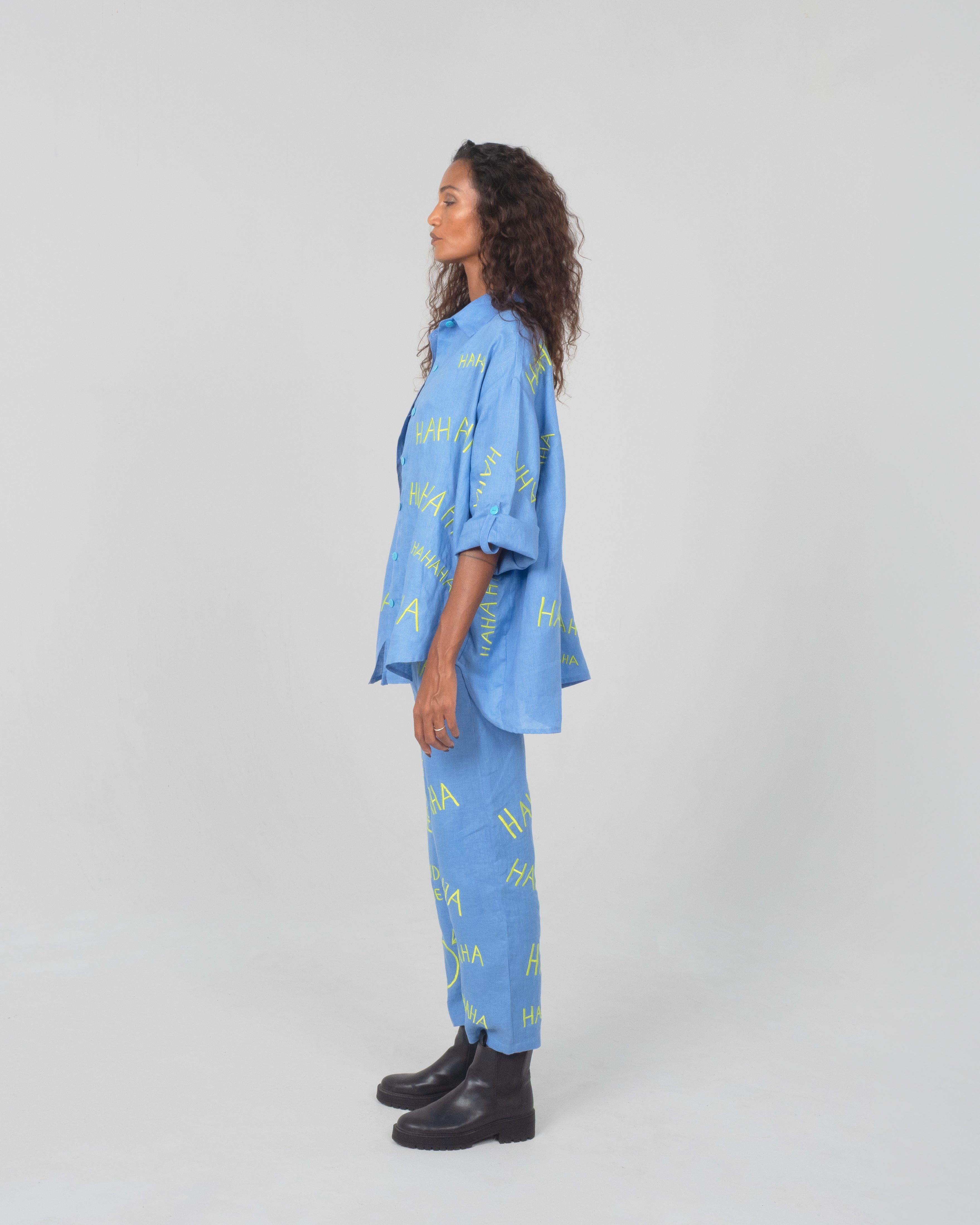 Hand-sketched by Ole Ukena in a state of flow and hand-embroidered in Ubud using free-motion machines (no computers involved), this piece is a visual rhythm of “HAHAs” that repeat like a nervous tick, a looped thought, a joke that almost—but never fully—makes sense.