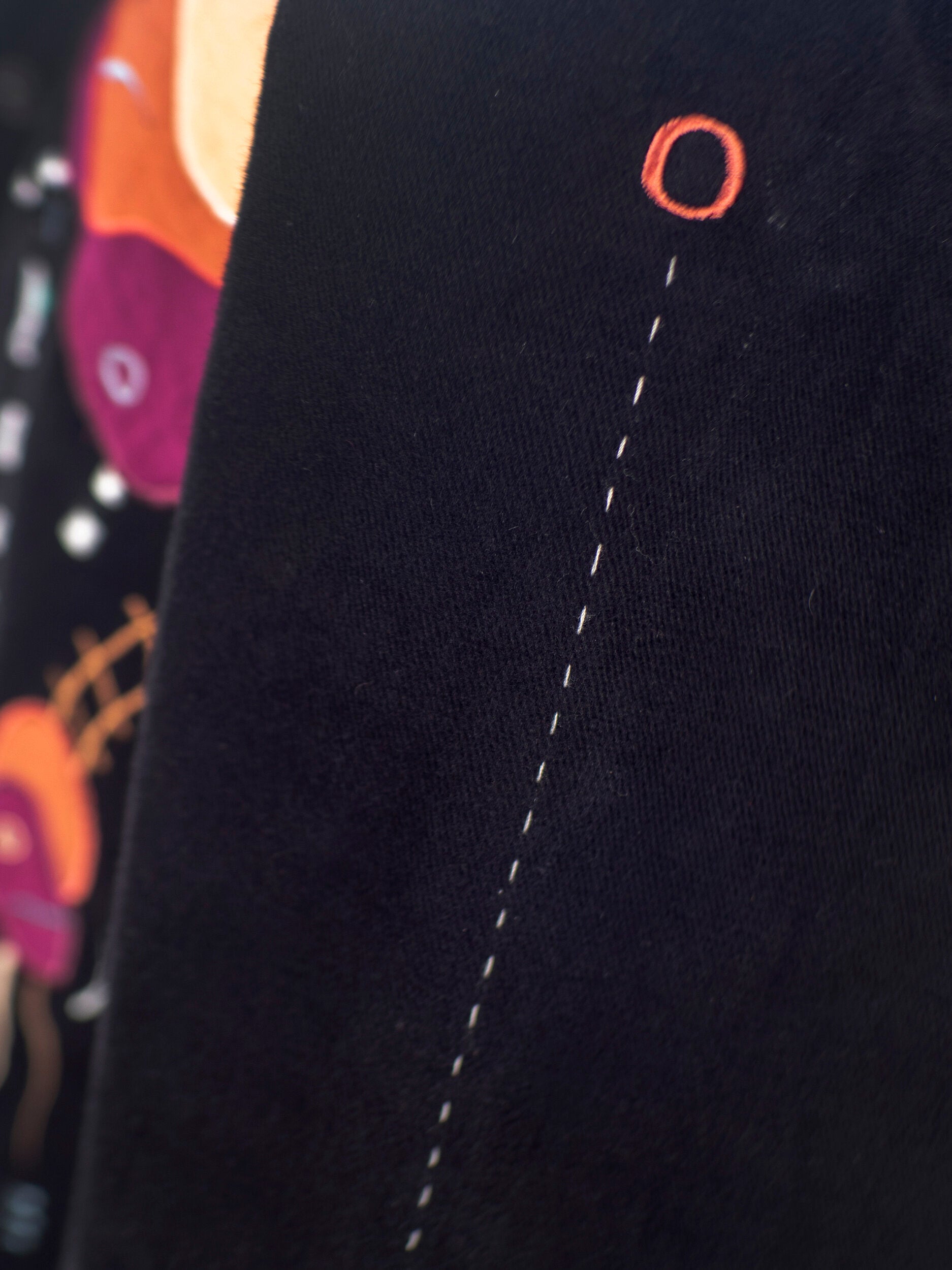 The Introverted Alien jacket is embroidered expression for those who feel a lot—but don’t always feel like explaining. A parade of playful lifeforms floats across the fabric, each with their own quiet agenda and questionable boundaries.