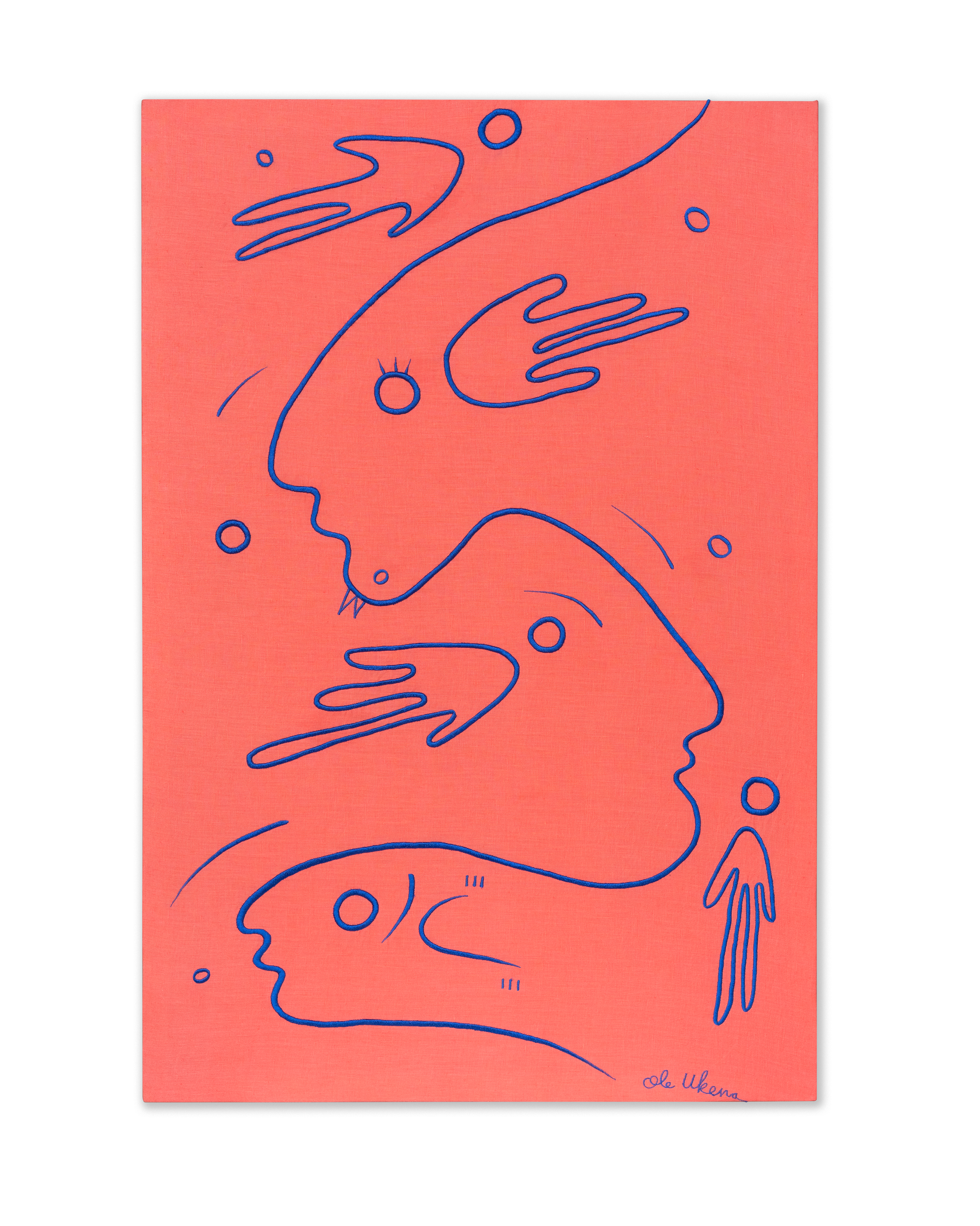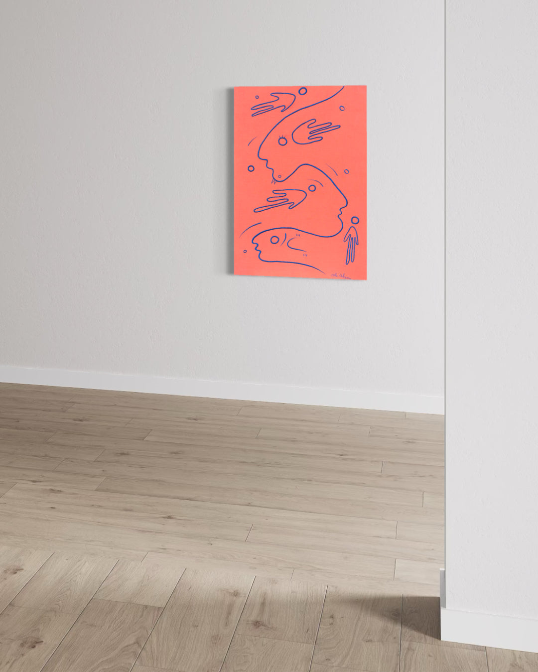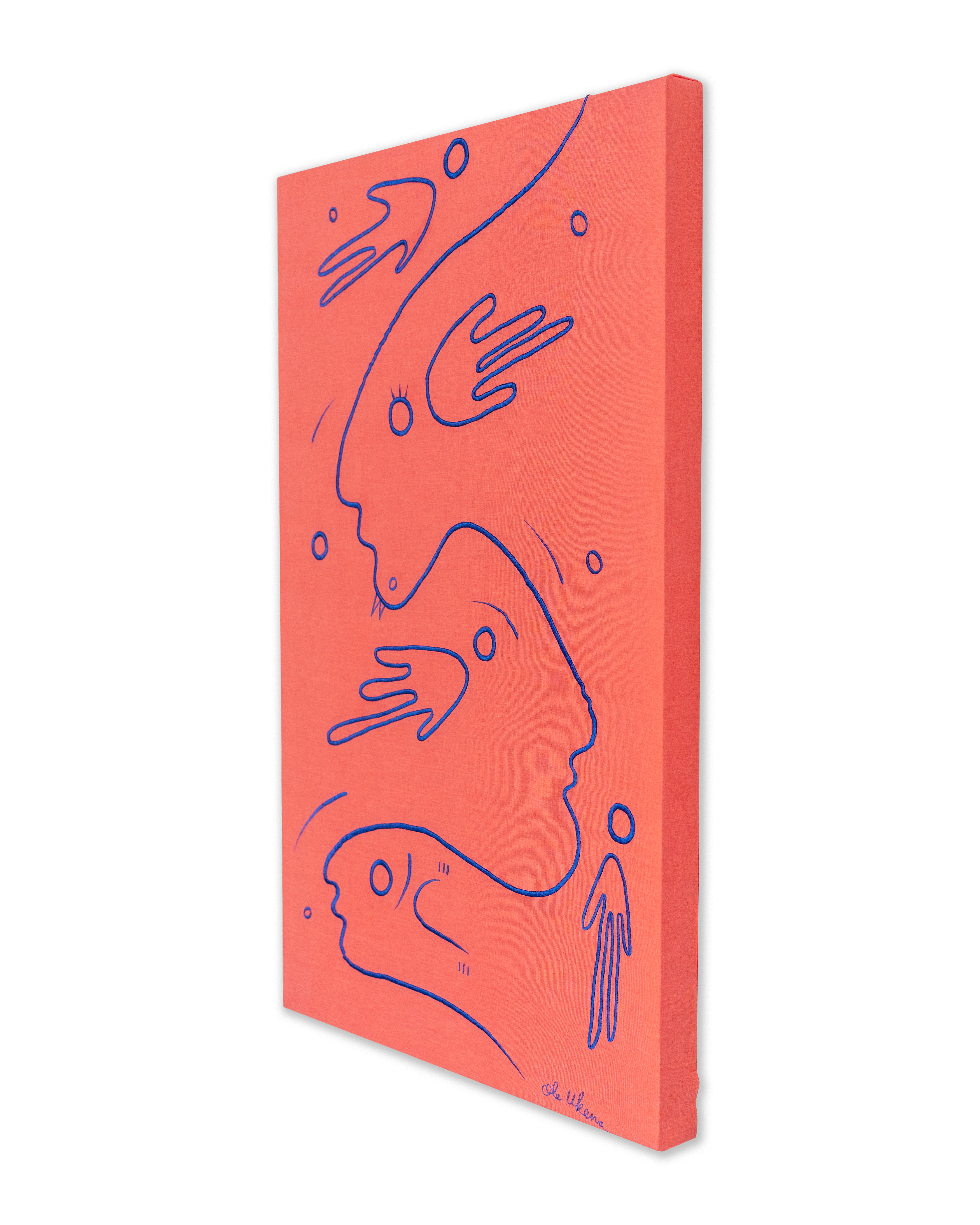 The forms are bold and raw: part creature, part emotion, part self. Eyes hover, faces stretch, and symbolic gestures dance across the fabric—interacting, witnessing, transforming. The result is somewhere between a doodle and a transmission.