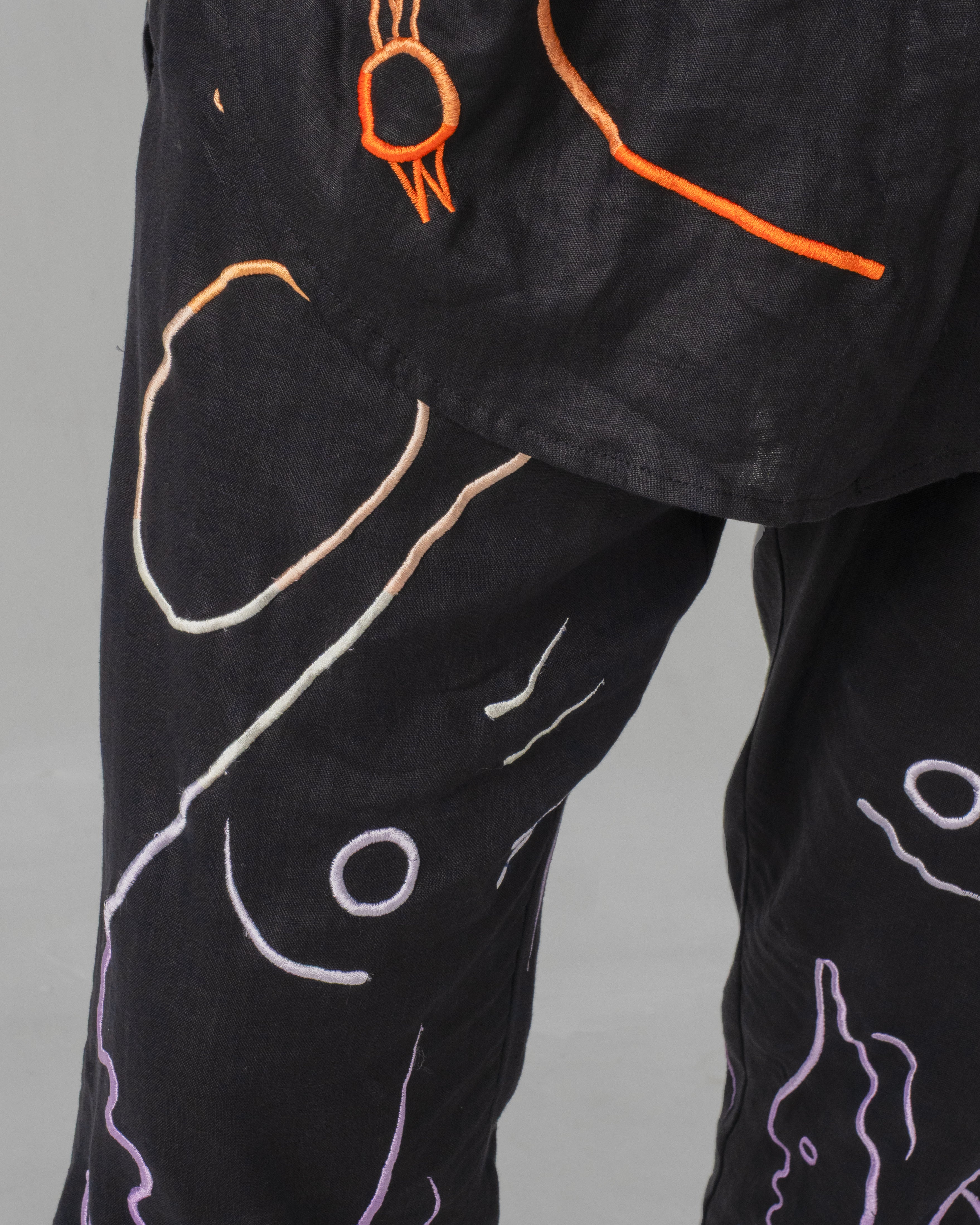 The shirt is cut from lighter linen for airflow, while the pants use a slightly thicker weave for structure and durability.