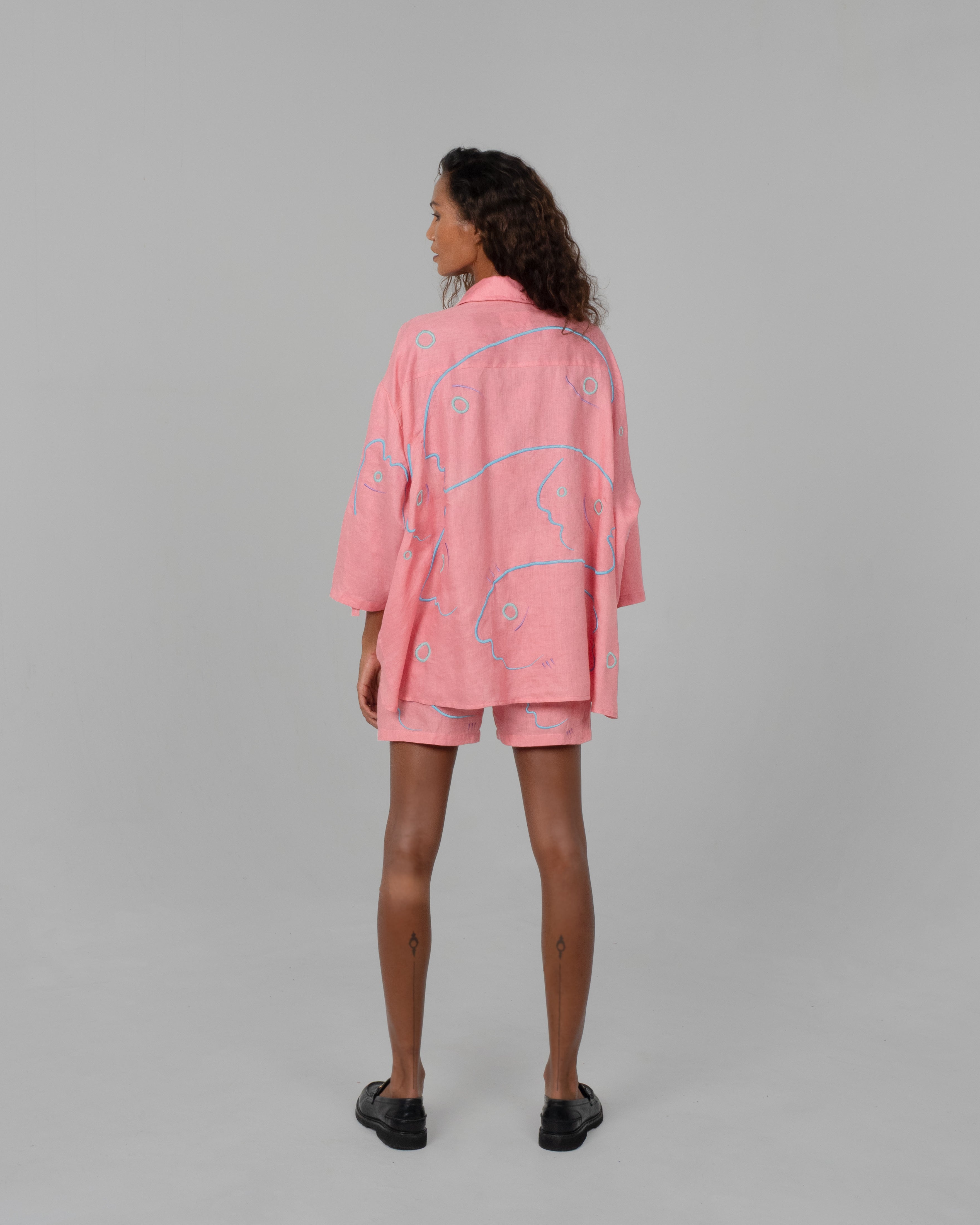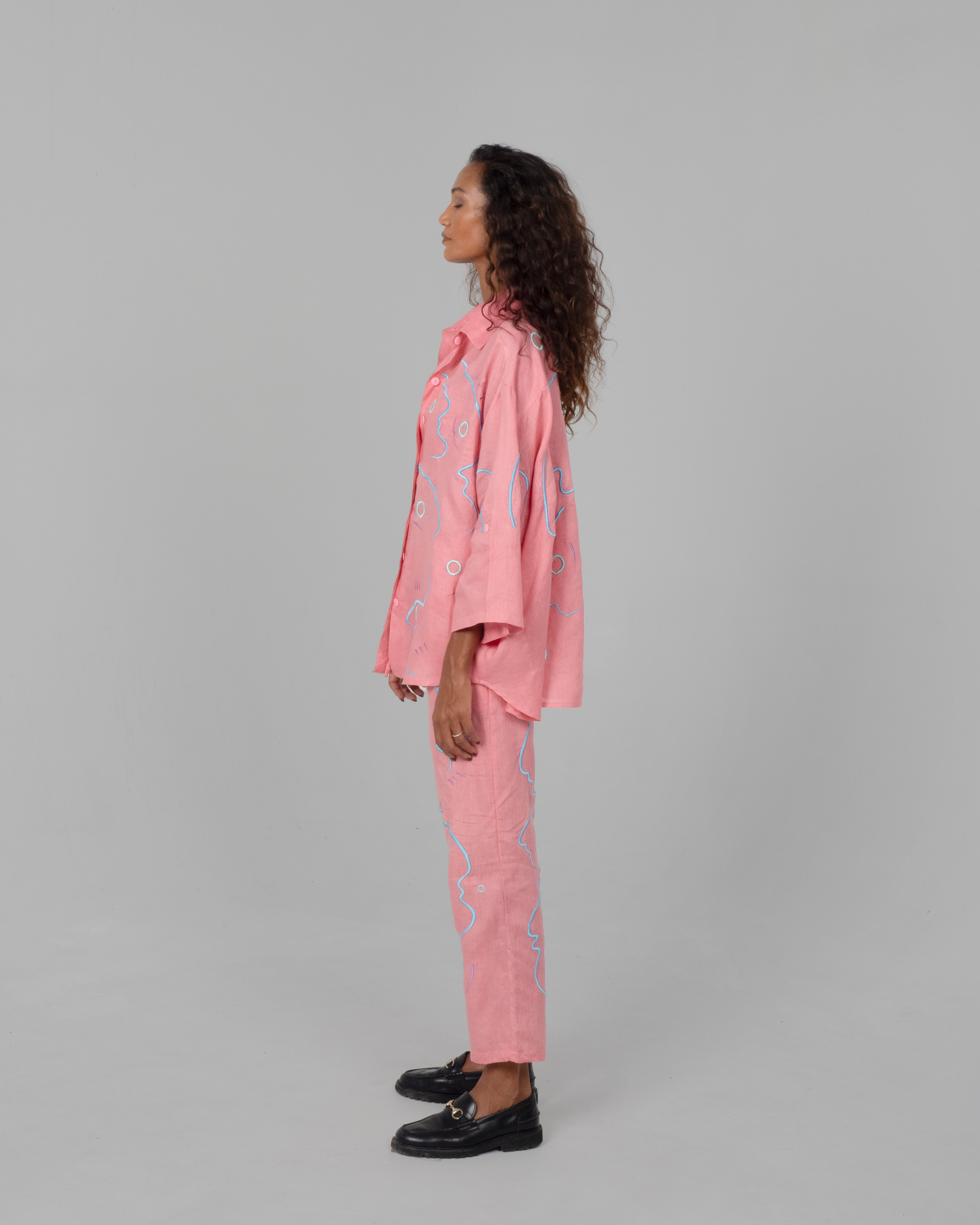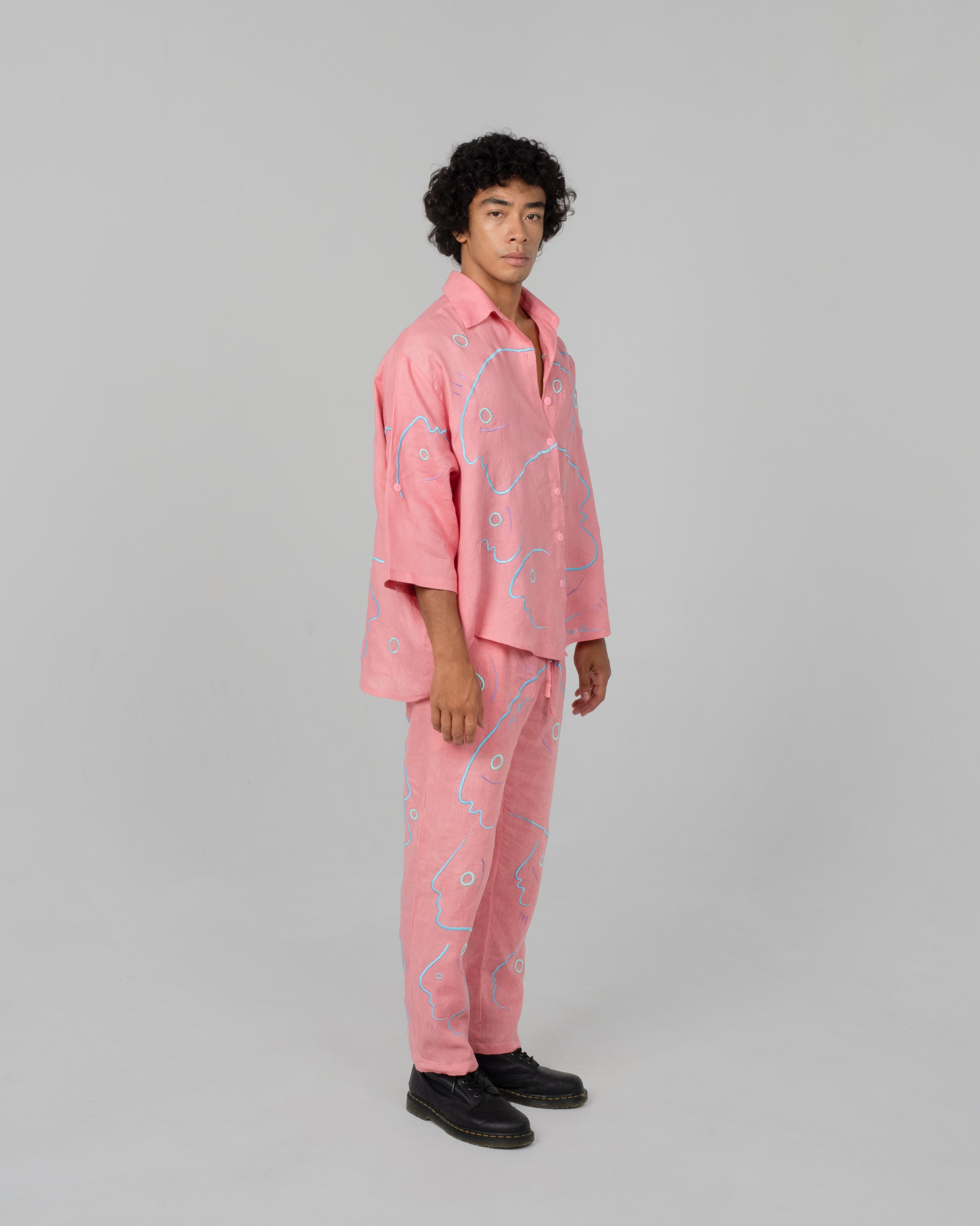 Material: 100% lightweight linen — breathable and soft. The shirt is cut from lighter linen for ease and airflow, while the pants use a slightly thicker weave for structure and durability.